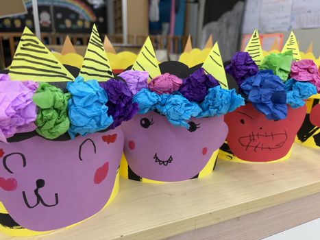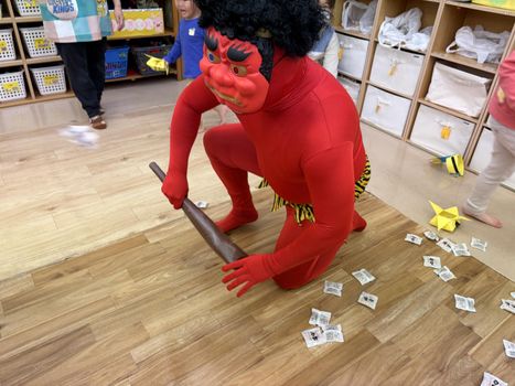 鬼のお面をクラスごとに作って、「鬼さんをやっつけるんだ!」と